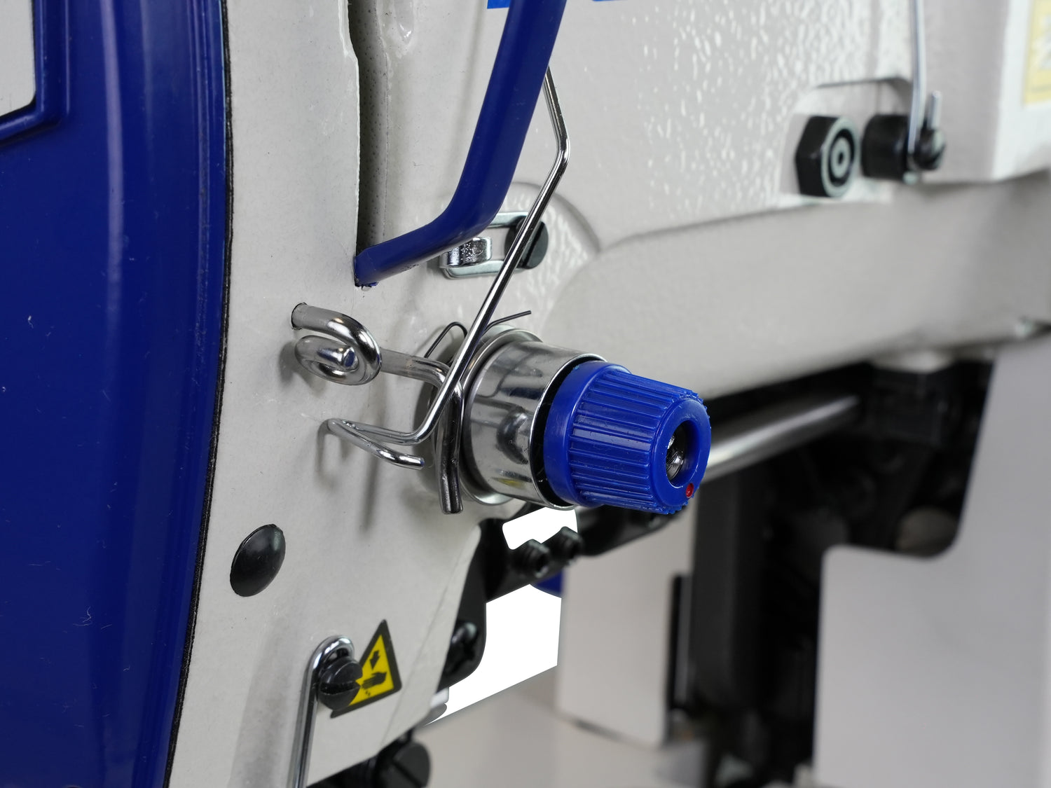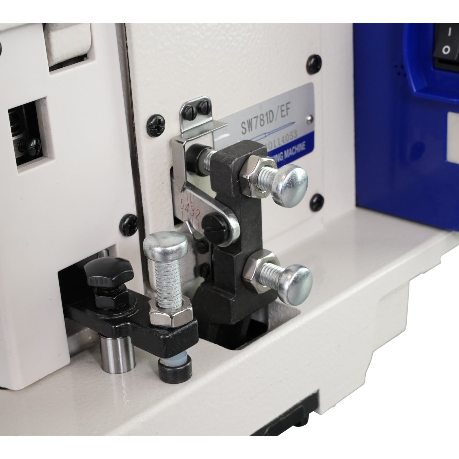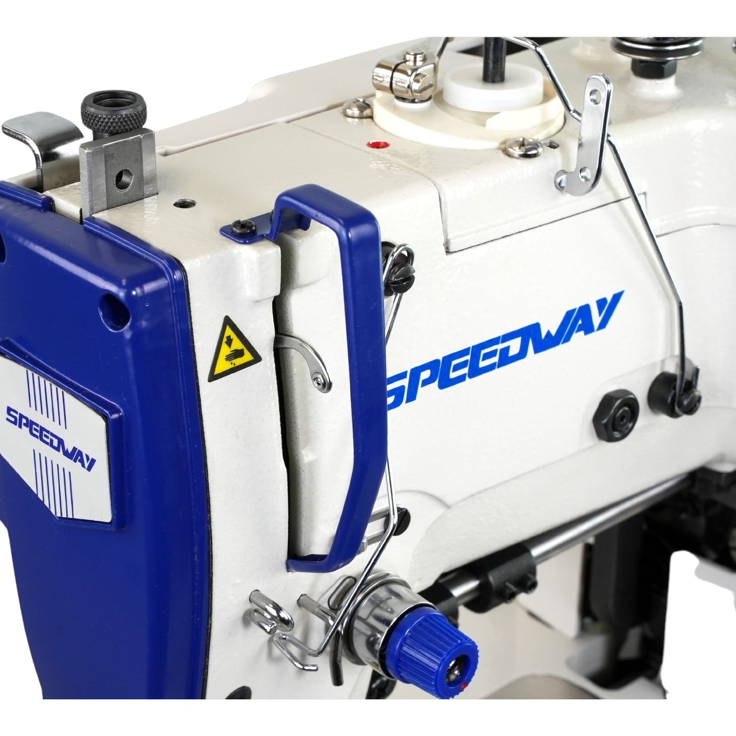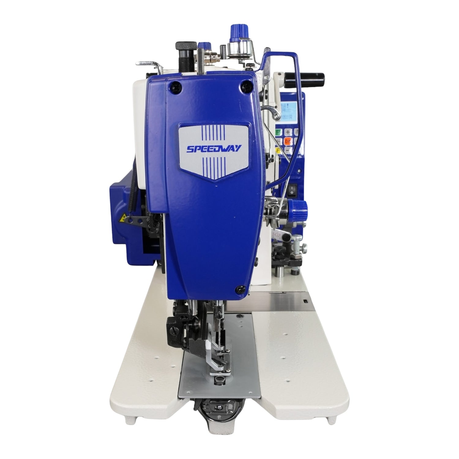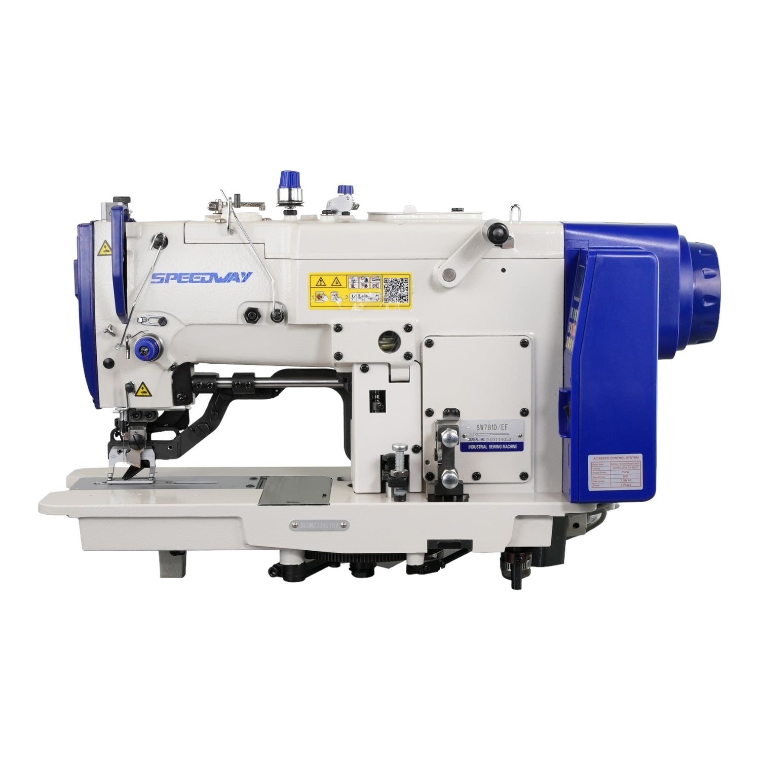 La máquina para hacer ojales con puntada de cadeneta de una sola aguja Speedway SW781D con motor integrado está accionada por un servomotor incorporado , con funciones como elevador automático del prensatelas y cortahilos.