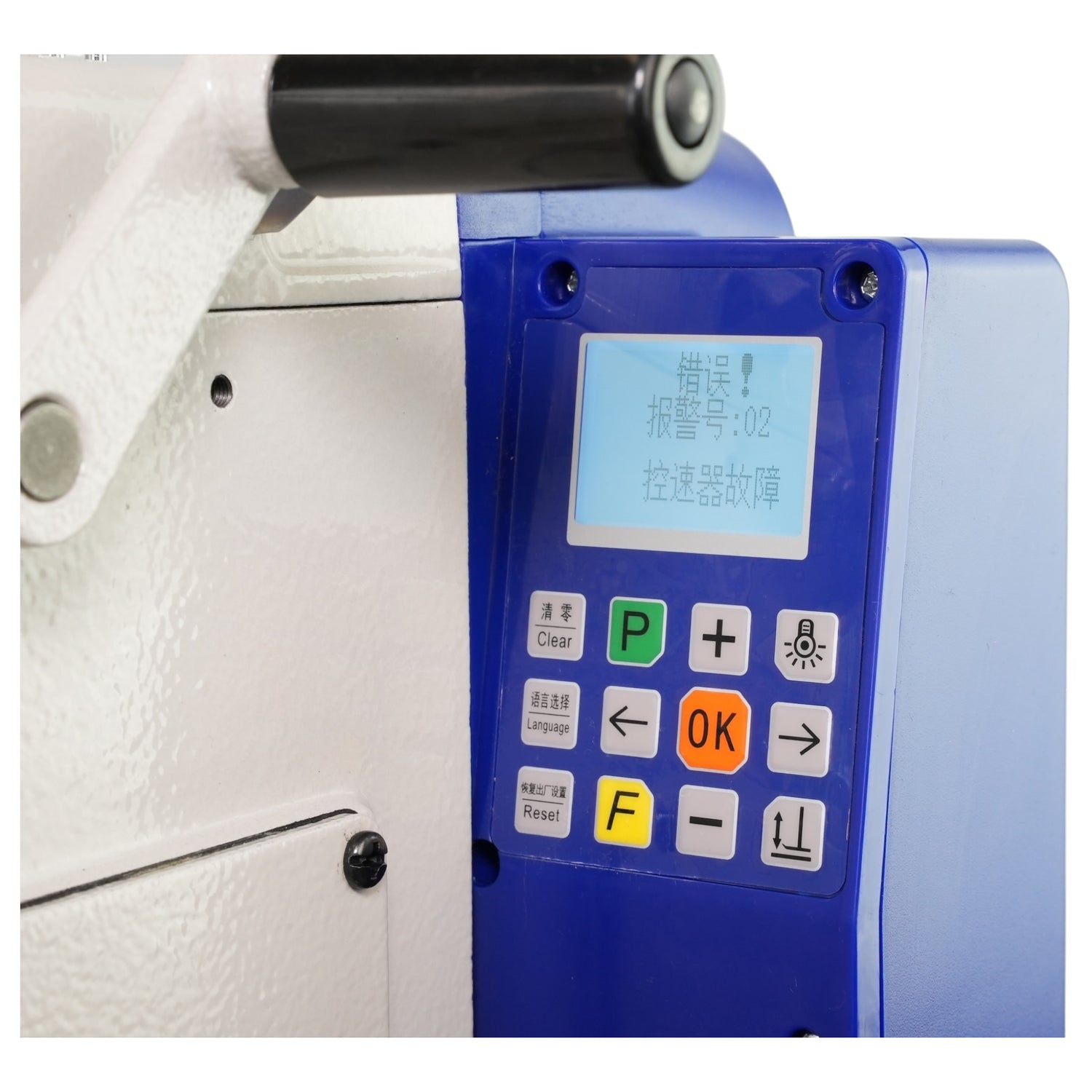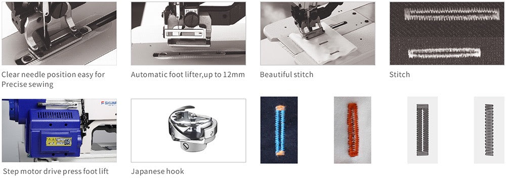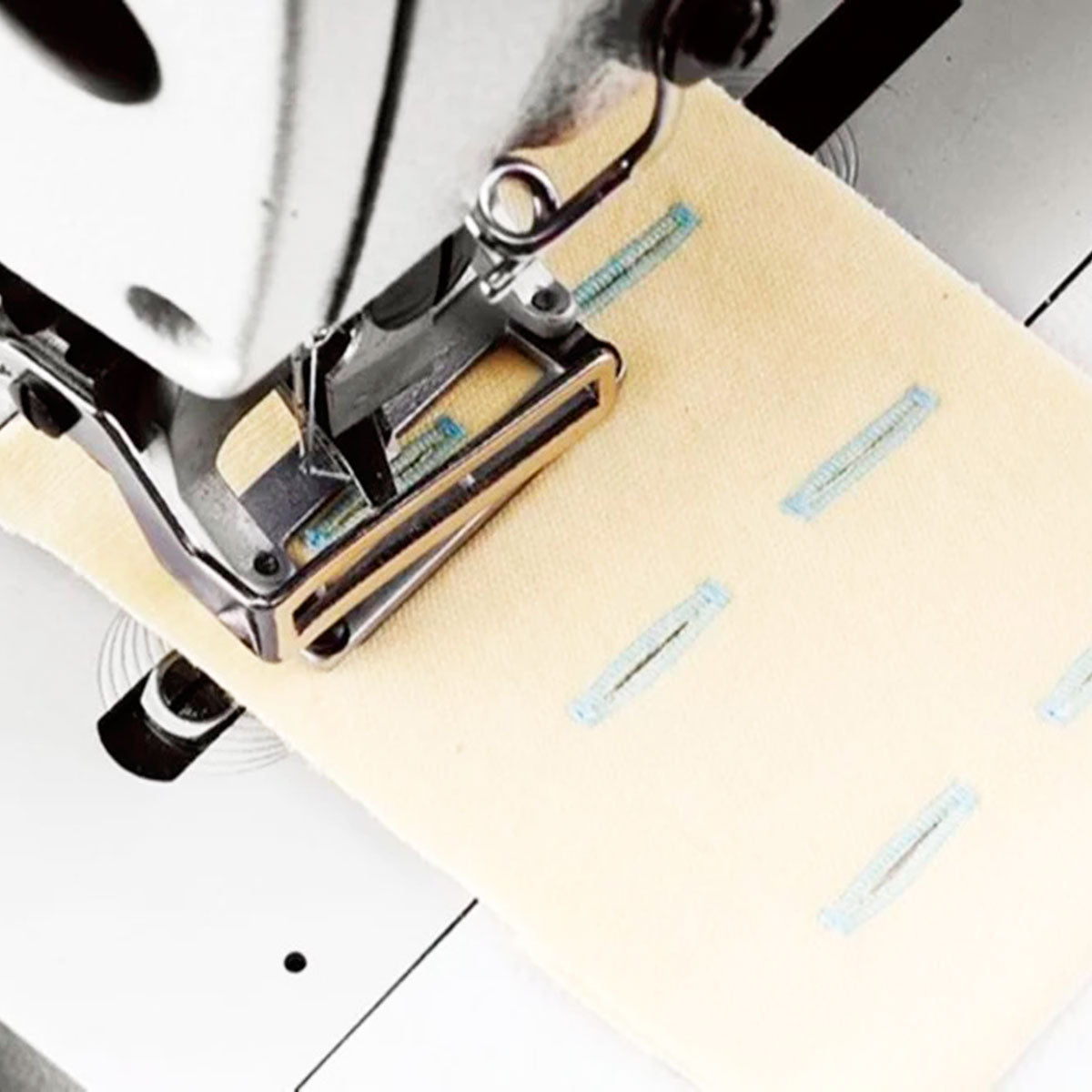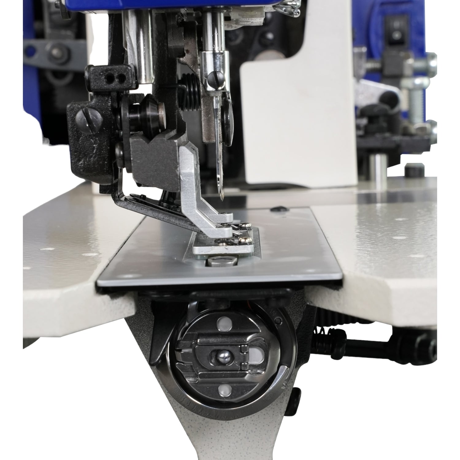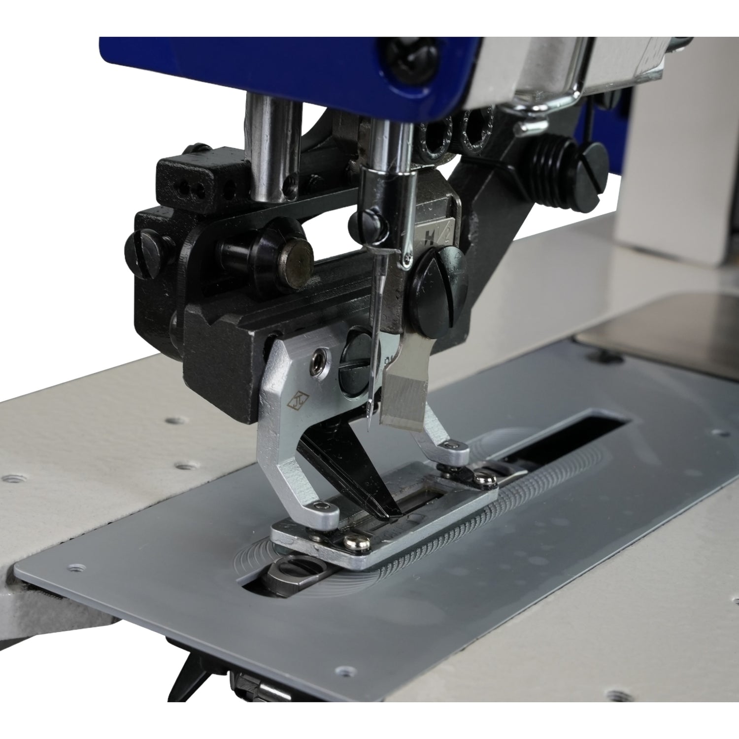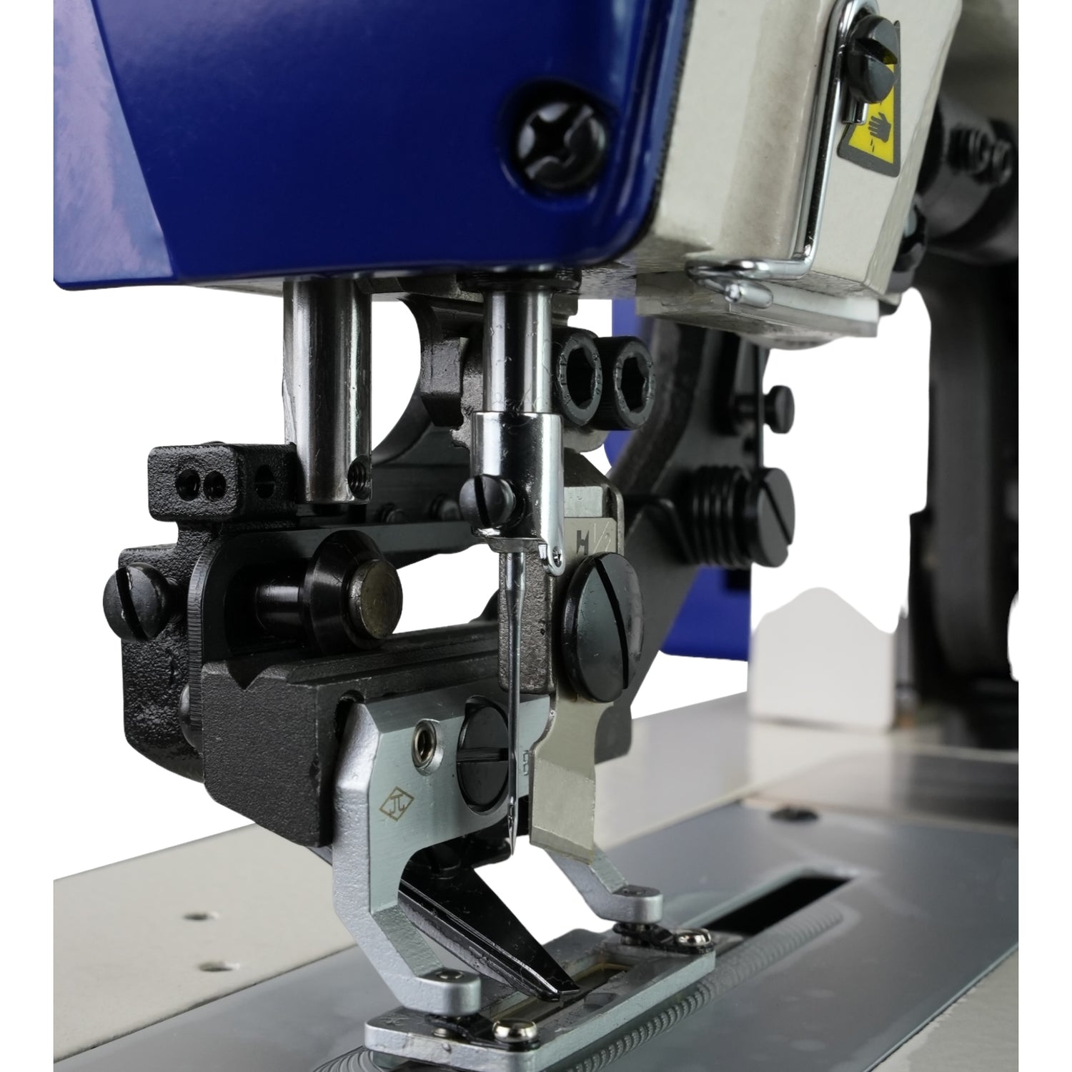 La máquina para hacer ojales con puntada de cadeneta de una sola aguja Speedway SW781D con motor integrado está accionada por un servomotor incorporado , con funciones como elevador automático del prensatelas y cortahilos.