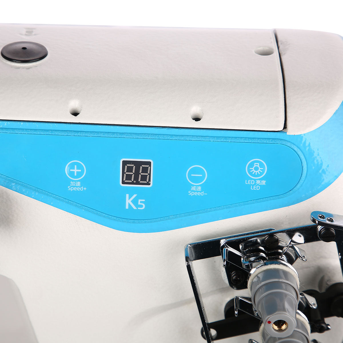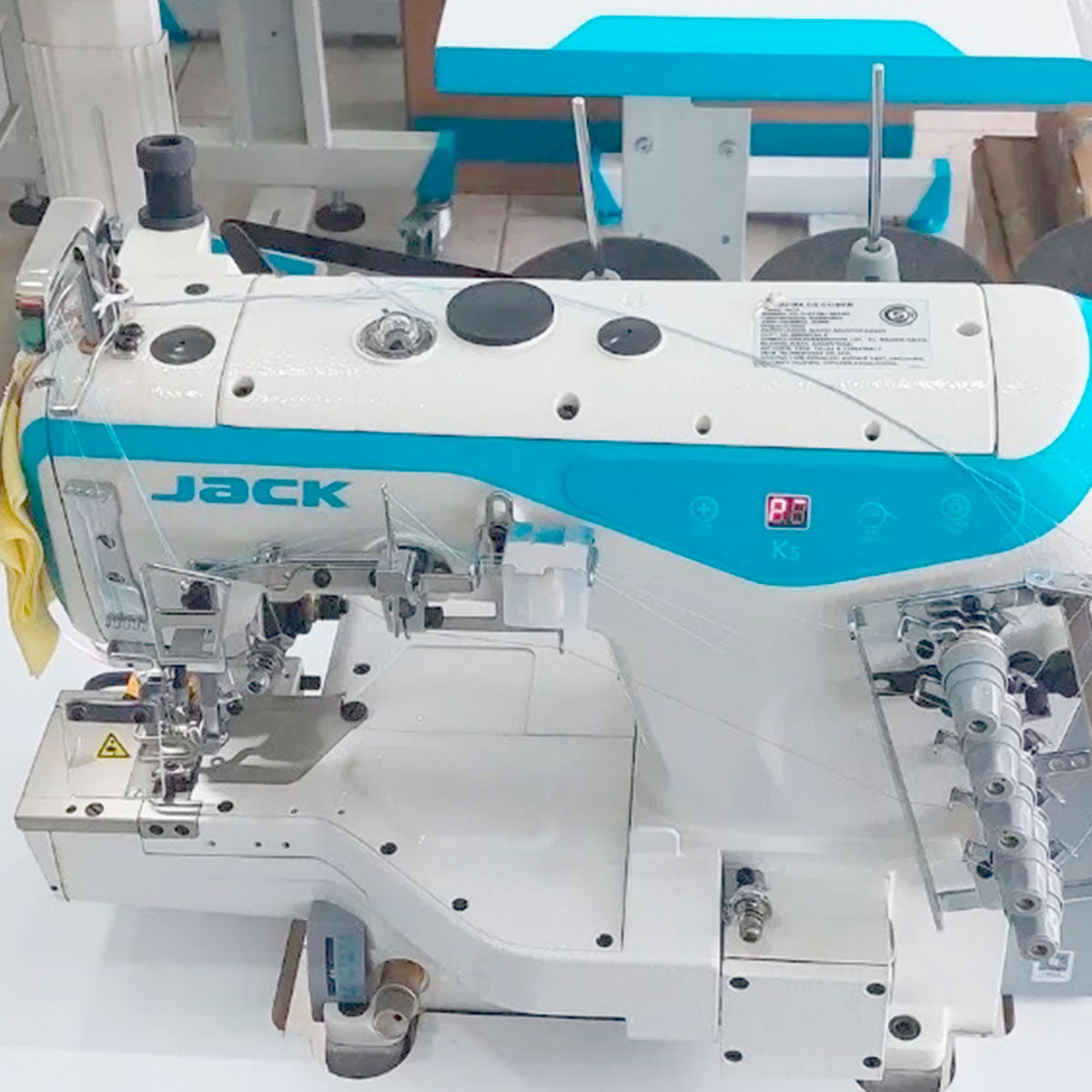 JACK K5-D-01GB×364 Máquina de coser industrial con brazo cilíndrico de 3 agujas, ensamblada con mesa y soporte incluidos
