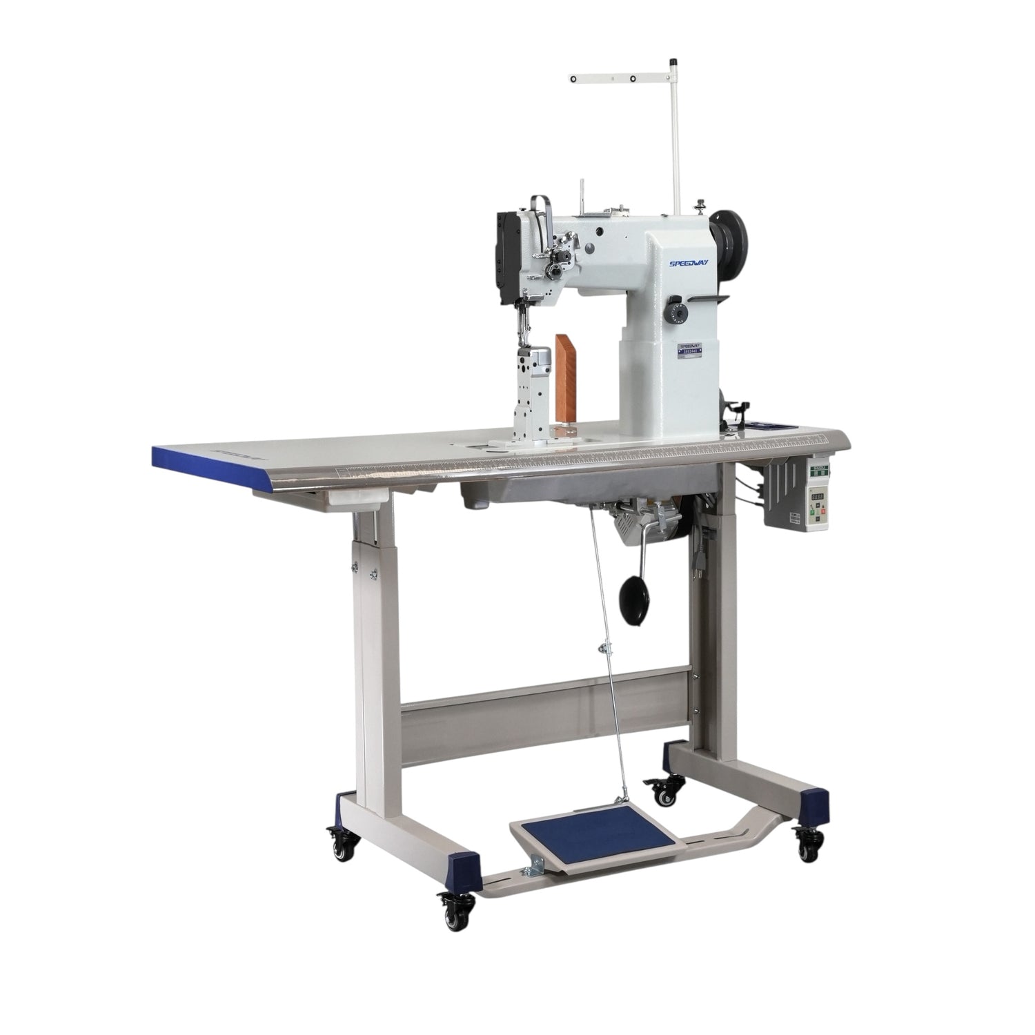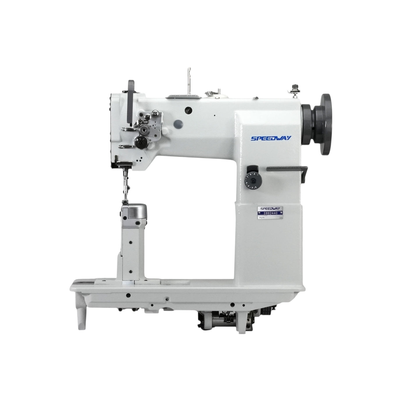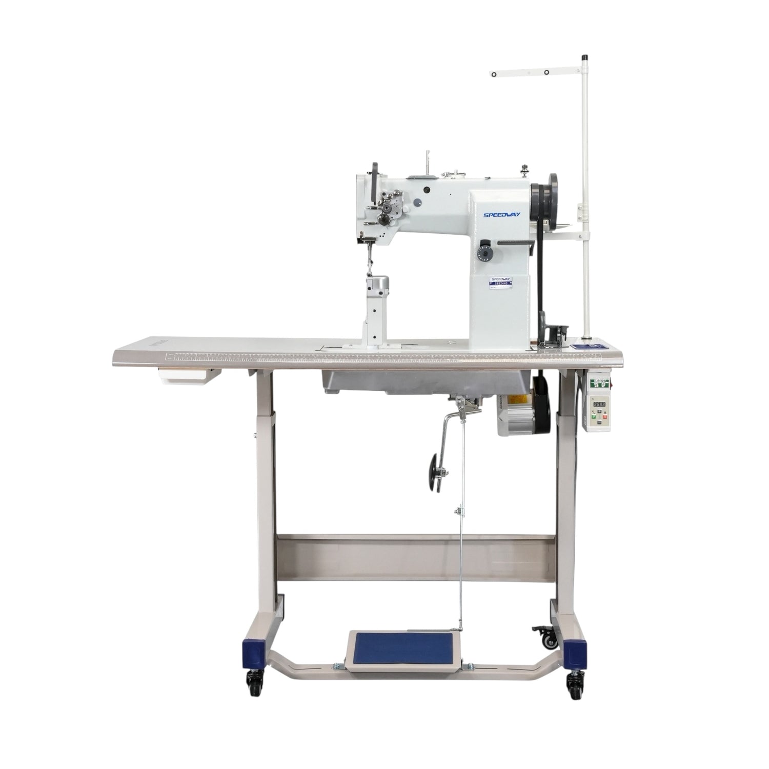 La Speedway SW82440 es una máquina de coser industrial de columna, de una sola aguja y alimentación compuesta, diseñada para trabajos precisos en materiales complejos y voluminosos. Con un garfio giratorio japonés de gran tamaño y un motor de 750 W , esta máquina ofrece una calidad de puntada y una fiabilidad superiores. Su diseño de columna facilita el acceso a zonas de difícil acceso, lo que la hace ideal para trabajos de precisión en cojines de asientos, zapatos, bolsos y tapicería de automóviles.