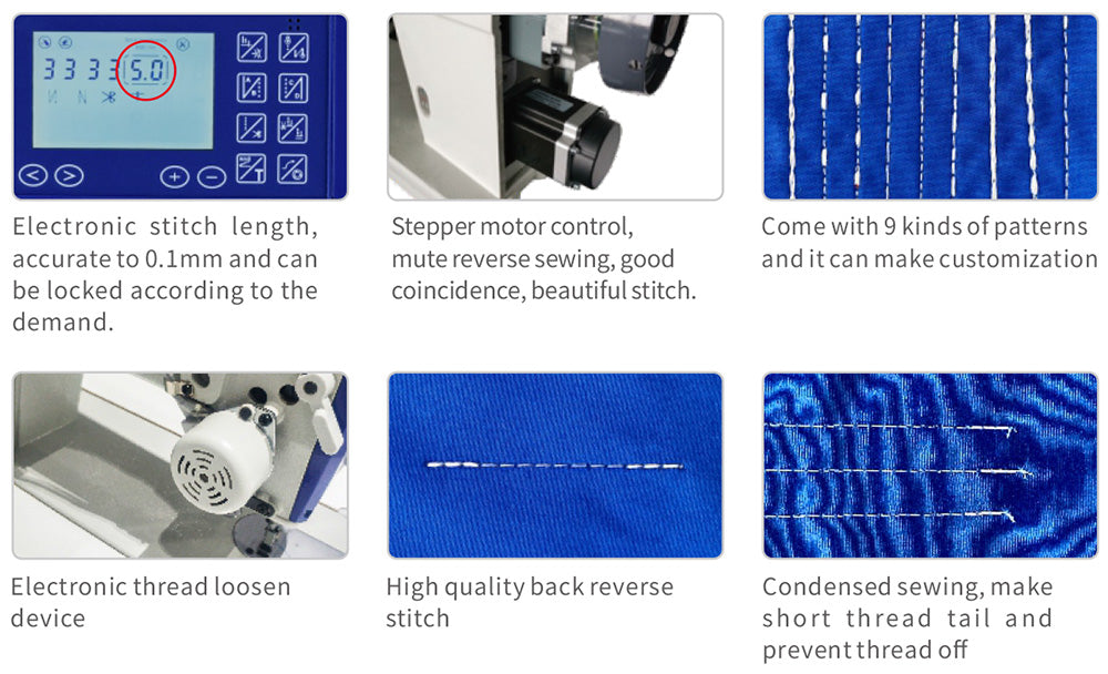 La máquina de puntada de cadeneta computarizada con cuatro funciones automáticas controlada por motor paso a paso ofrece un sonido más suave y más funciones que ahorran trabajo. Con un pie prensatela controlado por motor paso a paso, esta máquina proporciona una experiencia de costura conveniente y que ahorra trabajo.