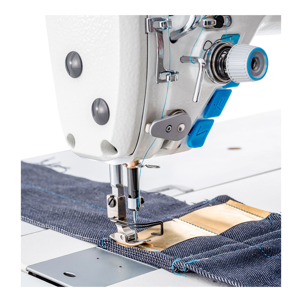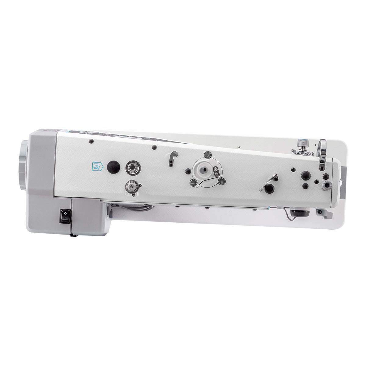The machine will adjust instantly during automatic sewing. This model has a closed oil sump and a 30.5 cm working area. The presser foot lifter is automatic and lifts up to 13 mm. It also has an automatic thread trimmer.